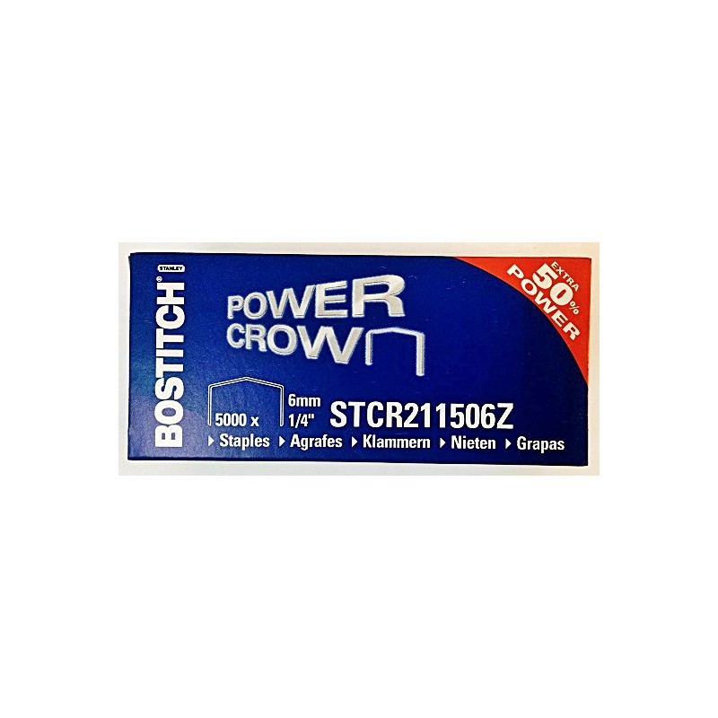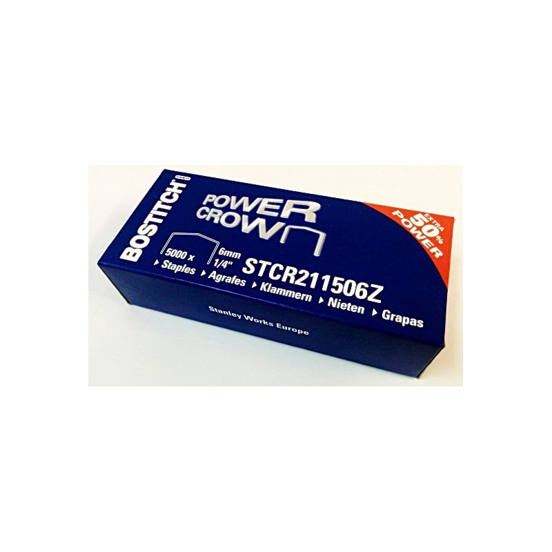 Grapa para grapadora manual marca Bostitch STCR2115 1/4 (6mm largo), grapa de frecuente uso para poner lazos y adornos en el sector calzados. Las grapas Bostitch 2115 6mm también tienen gran demanda en el sector textil y para uso en oficina y papelería. 5 millares por caja, marca original.
