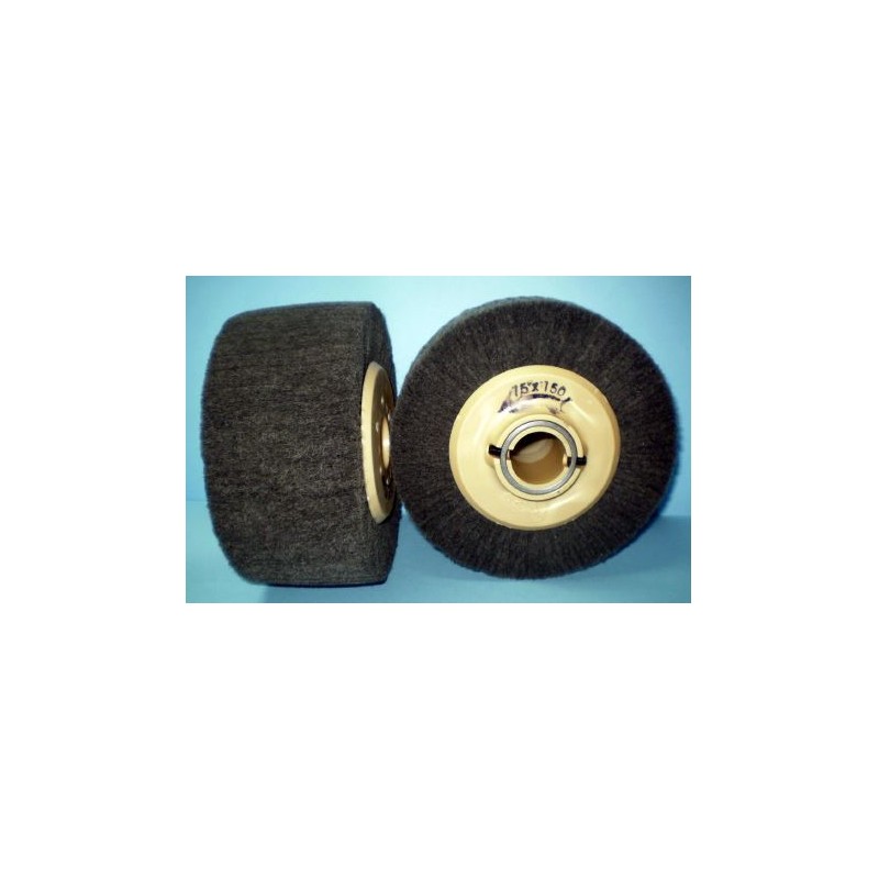Cepillo de limpieza superficial, hecho de abrasivo para usos de apomazado y pulido suave del calzado. Diámetro exterior 150 mm y ancho 75mm, eje de 35mm con casquillo de hierro para unir al eje.