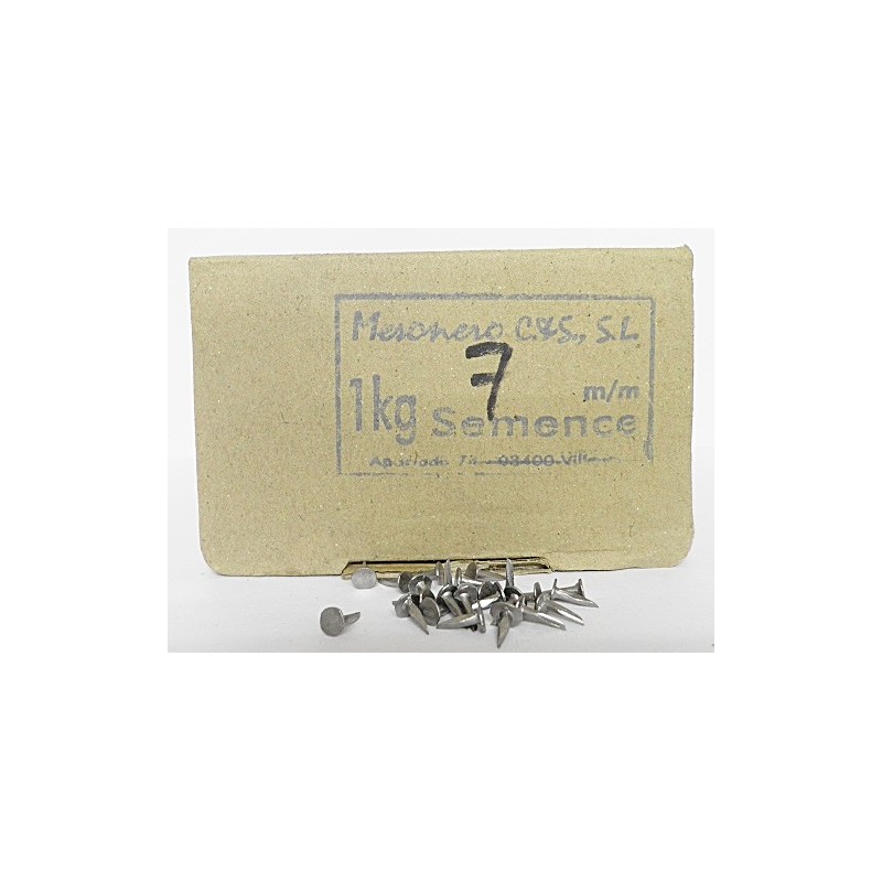 Clavo manual tipo semence 7mm largo, 1 kg por caja. Para montaje del zapato en la horma, marca Caturla y Robledo, fabricado en España.