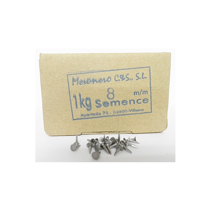 Clavo manual tipo semence 8mm largo, 1 kg por caja. Para montaje del zapato en la horma, marca Caturla y Robledo, fabricado en España.