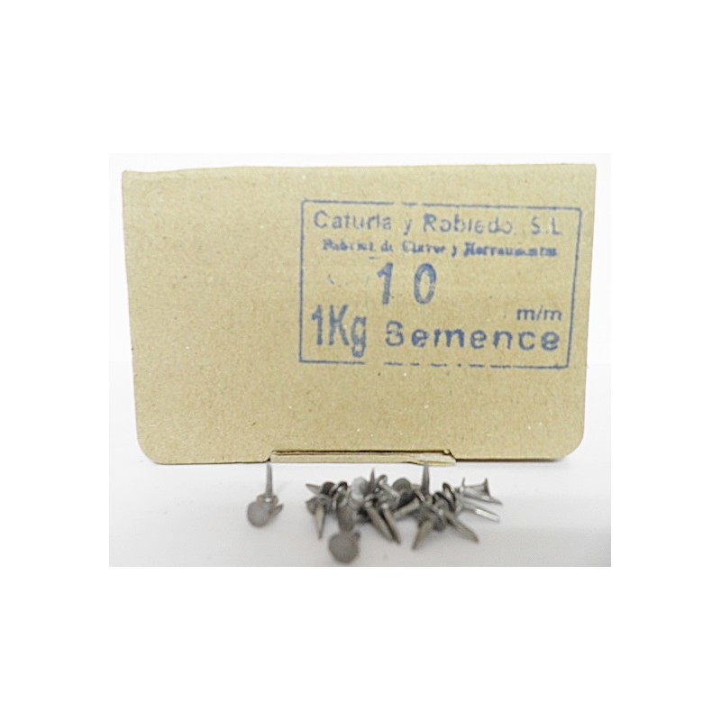 Clavo manual tipo semence 10mm largo, 1 kg por caja. Para montaje del zapato en la horma, marca Caturla y Robledo, fabricado en España.
