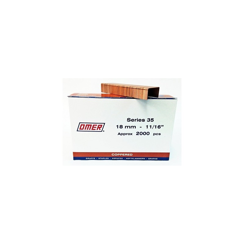Caja grapas 35/18 Omer, también conocidas por grapas serie 5/8, grapas de embalajes de cartón. 2 millares por caja. 18mm alto x 35mm ancho. Las grapas Omer 35/18 funcionan tanto para la grapadora manual 35.18 M de Omer como para la neumática 35.22.