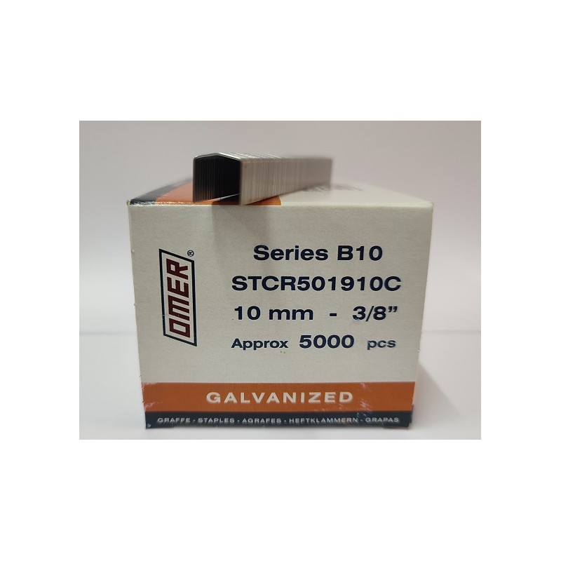 Grapas STCR 5019 10 mm de largo de la Marca Omer, completamente compatibles con máquinas Bostitch. Grapa galvanizadas que se utilizan en numerosas aplicaciones como etiquetado de textiles gruesos, materiales flexibles tipo cartones, plasticos, y muchas otras aplicaciones