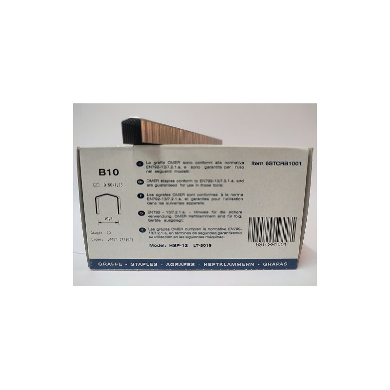 Grapa para grapadora manual STCR 5019 3/8 (10mm largo), 20GA denominación inglesa, grapa muy usada en industria textil para etiquetación de materiales más gruesos como mantas o tejidos gruesos, grapa de Marca Omer referencia B10 10MM, totalmente compatible con las máquinas Bostitch.
