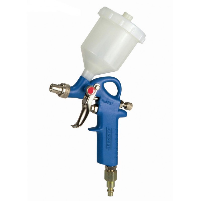 Pistola aerográfica E-22, usada para difuminar y hacer retoques en todo tipo de superficies. La máquina E-22 Kripxe trabaja en áera circular para aplicar el fluido. Pasos admitidos 0.5 y 0.8 mm. Deposito de nylon de gravedad con 0.25 litro de capacidad.