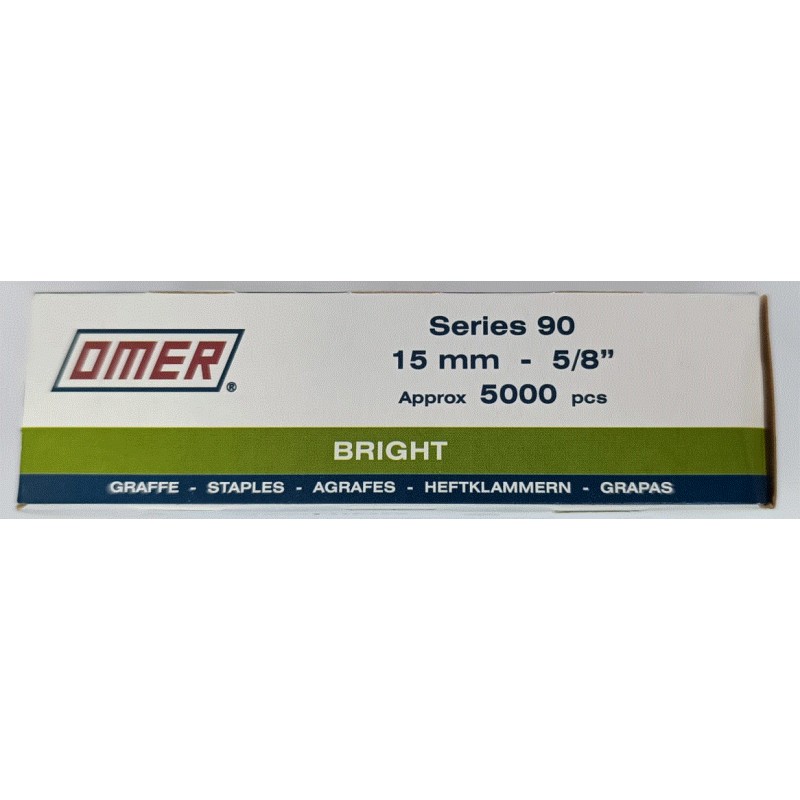 Grapas 90/15 de la firma Omer, grapas para fijación a palets de alambre medio que da dureza a la unión. La serie 90 es de amplio uso en industria del mueble y construcción. 5.000 unidades contiene la caja.