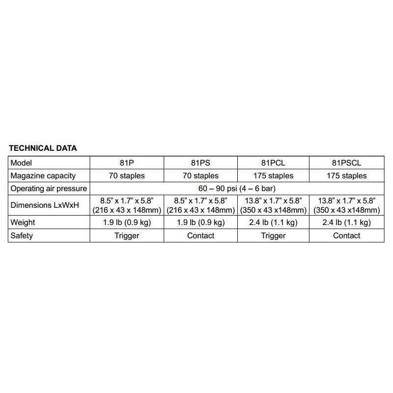Grapadora neumática Omer 81P para usar con grapas de las series 81P de la marca Raptor aptas para infusión. Para trabajar entre 4-6 atmosferas, capacidad para 70 grapas. La marca Omer siempre es garantía de calidad, es pionera en el mundo de las grapadoras industriales.