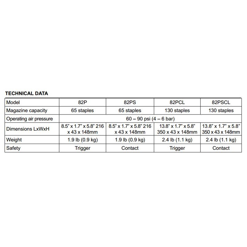 Grapadora neumática Omer 82P SCL para usar con grapas de las series 82P de la marca Raptor aptas para infusión. Para trabajar entre 4-6 atmosferas, carro largo para grandes producciones con capacidad para 130 grapas también con morro largo para trabajos en zonas de dificil acceso.