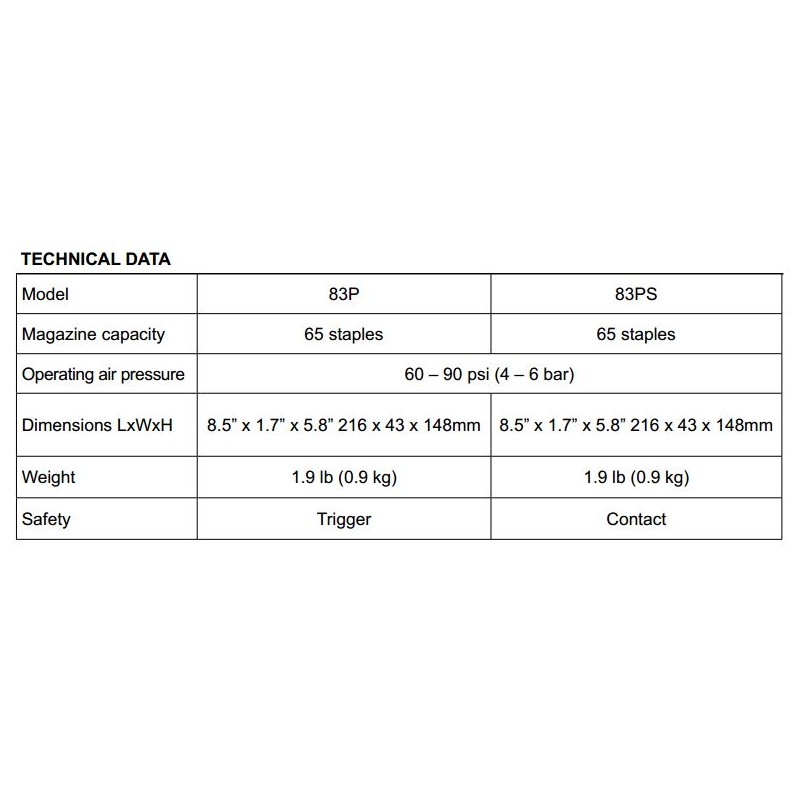 Grapadora neumática Omer 83P para utilización con grapas de la gama 83P de la marca Raptor no metálicas. Para trabajar entre 4-6 atmosferas, capacidad para 65 grapas. Omer es referencia mundial en grapadoras neumáticas de alto rendimiento.