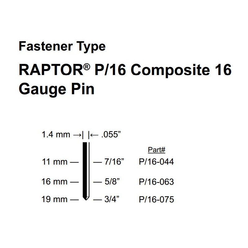 Caja de Pins Raptor 16G series 14P/11, 11 milímetros de largo, puntas de material plástico polímero, no metálicas aptas para infusión con resinas y uso en fibra de vidrio y materiales compuestos, usadas en industria naval, aeronáutica y eólica. 2500 unidades por caja.