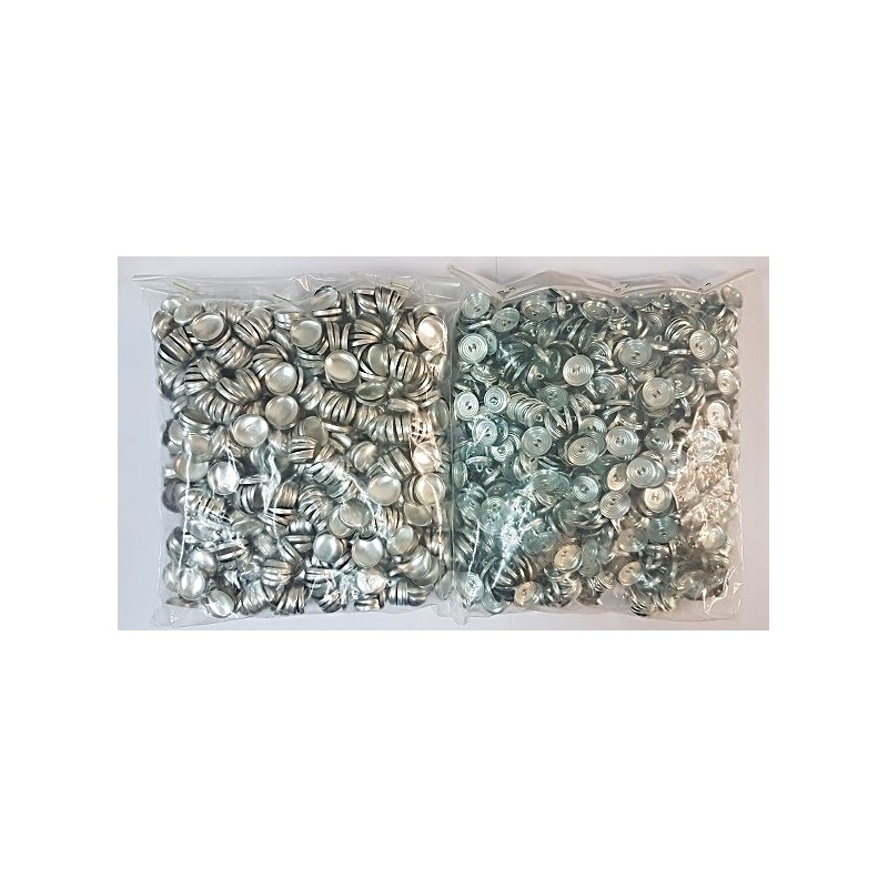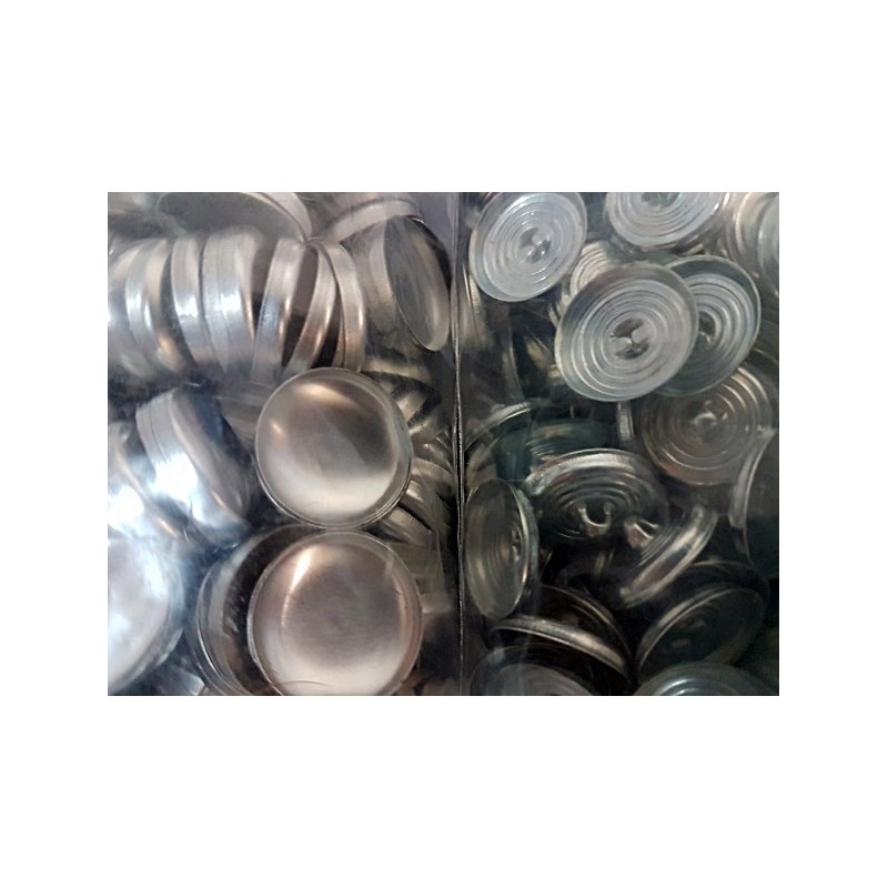 Botones metálicos para forrar a máquina. Tamaño del botón de 20mm de diámetro, se venden en bolsas de 1 millar separadas en la parte trasera y parte delantera para su forrado con tela o material.